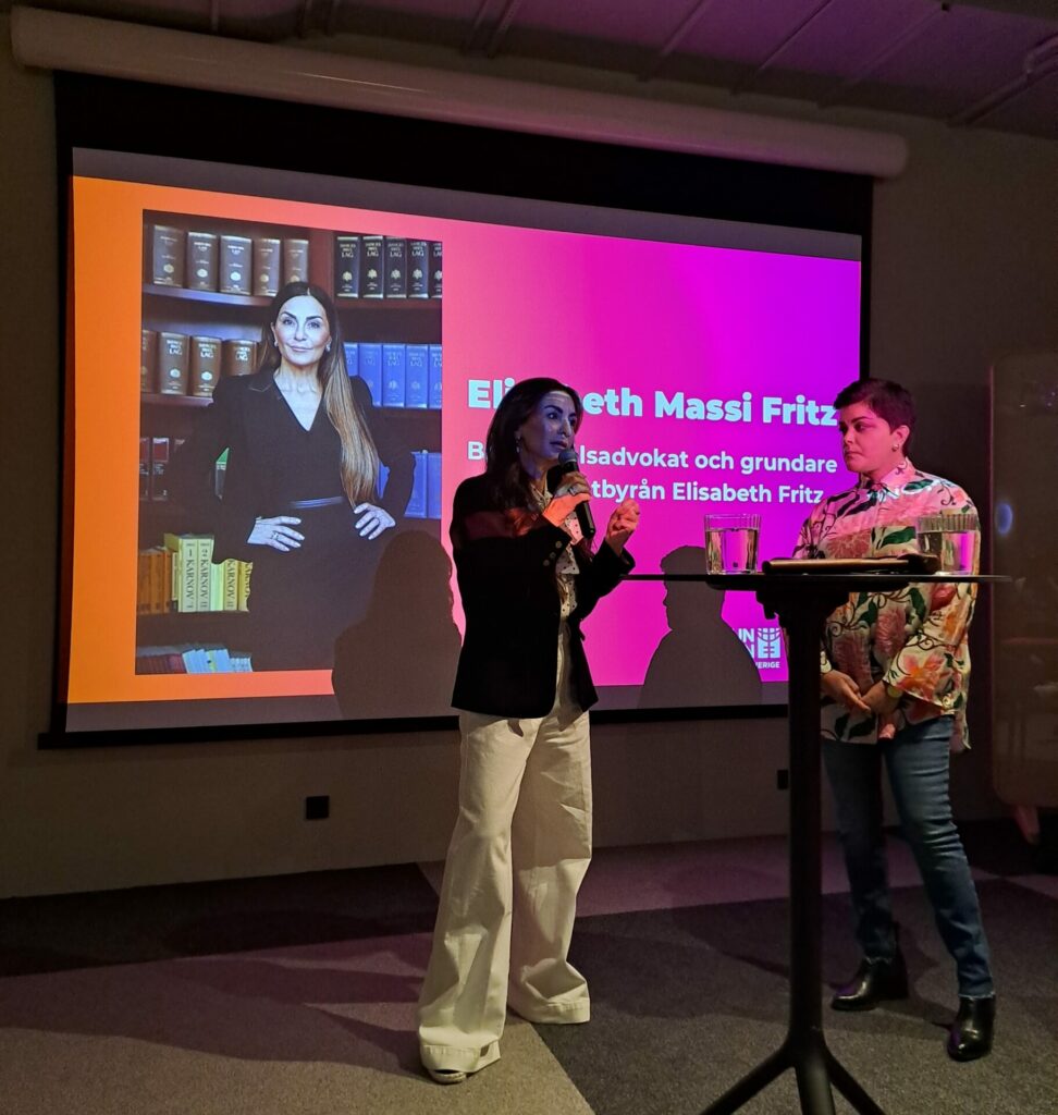 Mötet inleddes med ett samtal mellan UN Women Sveriges ordförande Parul Sharma och Elisabeth Massi Fritz, brottmålsadvokat och grundare av Advokatbyrån Elisabeth Fritz. Under samtalet delade Massi Fritz med sig av sina erfarenheter av att företräda våldsutsatta som målsägandebiträde, med särskilt fokus på mäns våld mot kvinnor och hedersrelaterat våld. Samtalet belyste både rättssystemets roll och de strukturella utmaningar som fortsatt behöver adresseras i jämställdhetsarbetet.